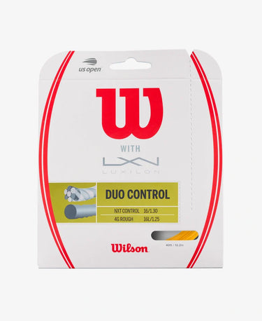 Wilson's Duo Control is a hybrid string that blends NXT Control (16/1.32) with Luxilon 4G Rough (17/1.25) for a string bed that scores well in spin, precision and tension maintenance. For ideal playability, reduce tension on Luxilon 4G Rough at least 10%. Either string can be installed in the mains for superior control and performance.